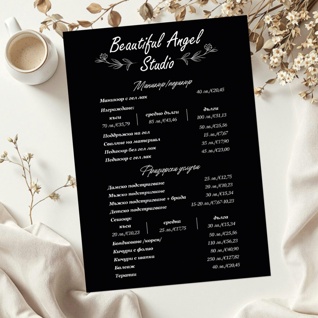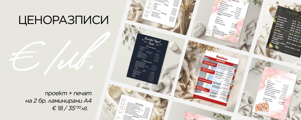 Предлагаме изработка на ценоразпис с включен проект и печат на до 2 бр. А4. Можете да поръчате и по-голям ценоразпис, като форматния ламинат е до размер А3. Освен това може да се направи със сгъване, тип брошура или да обсъдим всичко, което имате като идея и искате да се направи.